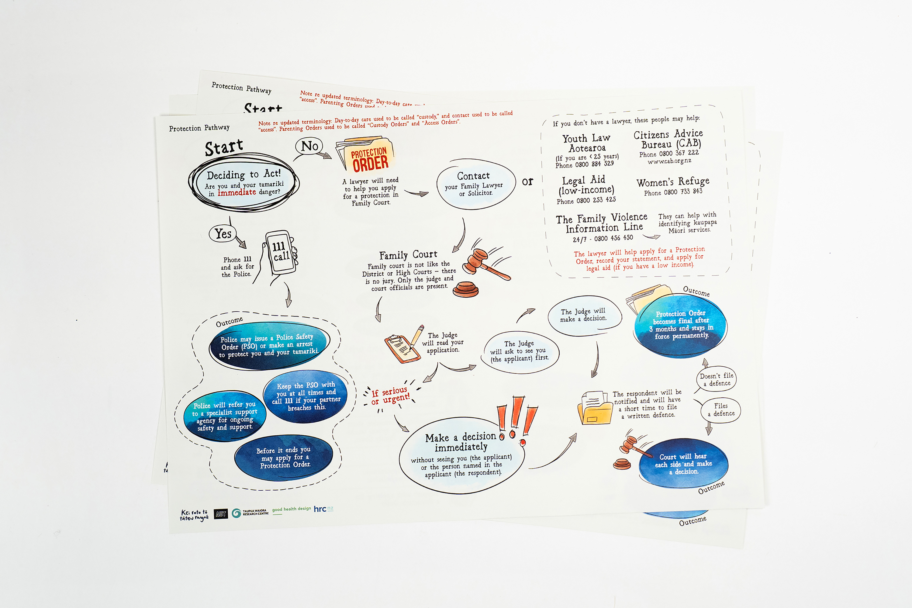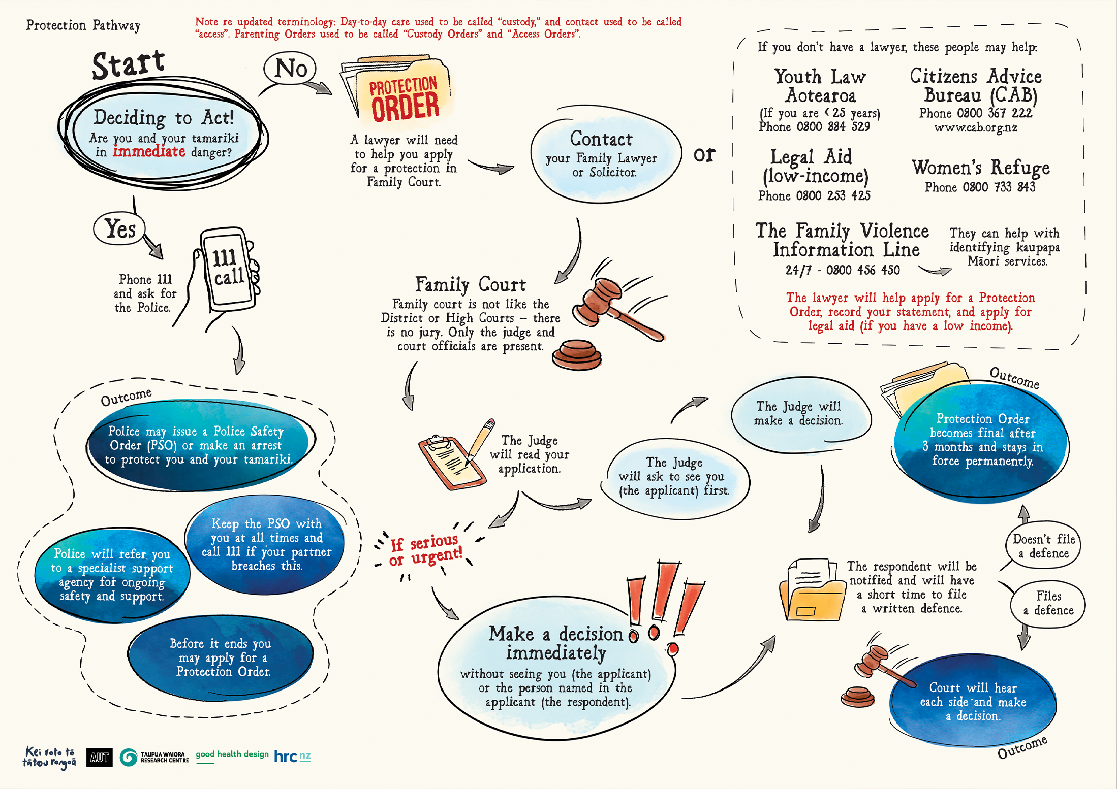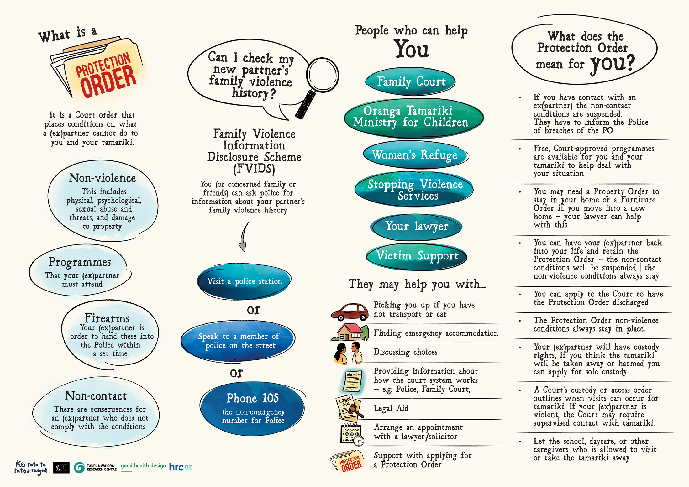 Download ResourceThe Protection Order Pathway is a journey map designed to help whānau understand complex legal processes around protection orders. It presents information in a clear and accessible way to support whānau to navigate stressful systems, know their rights, and take informed steps toward safety, clarity, and empowerment.
